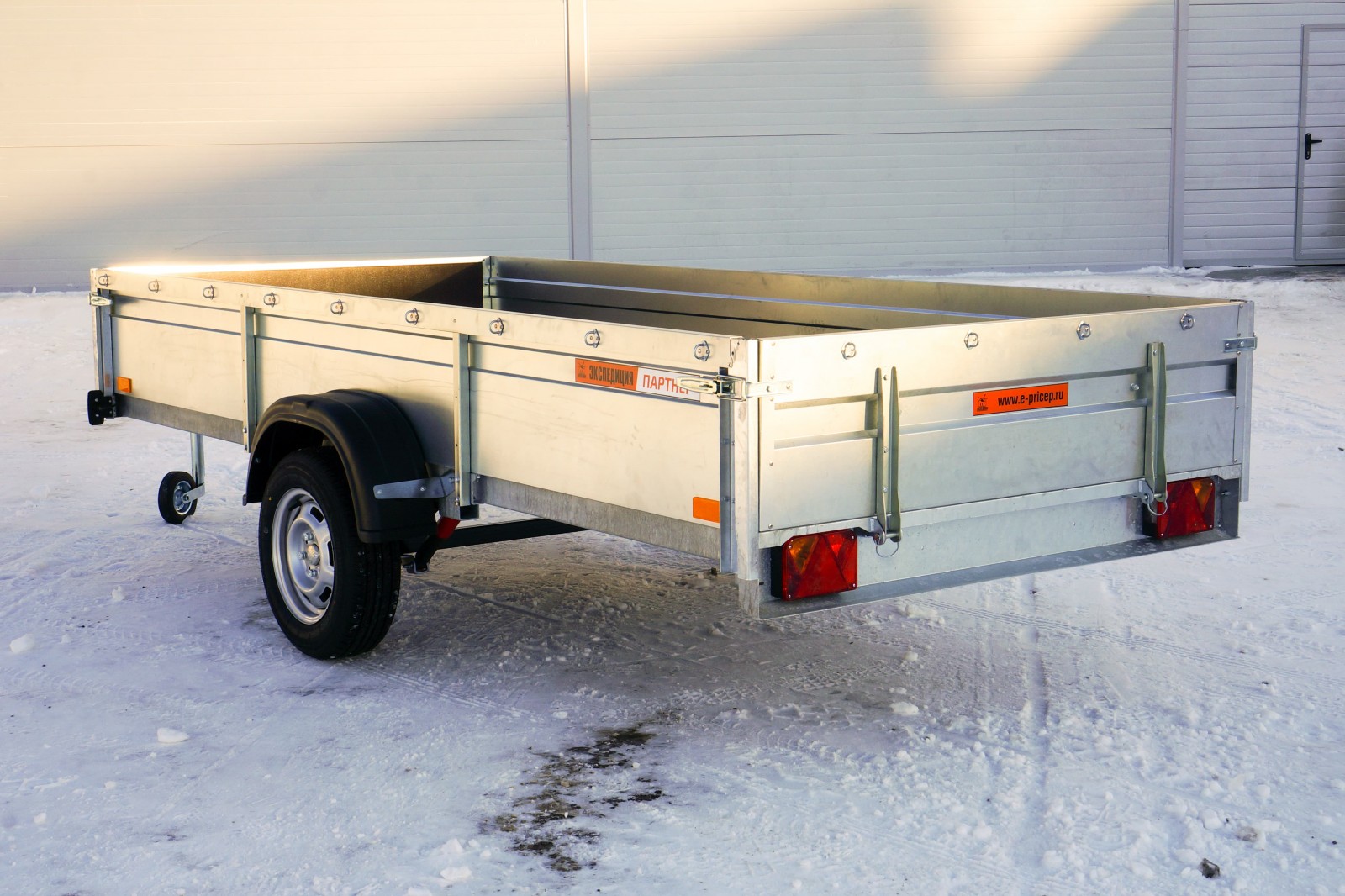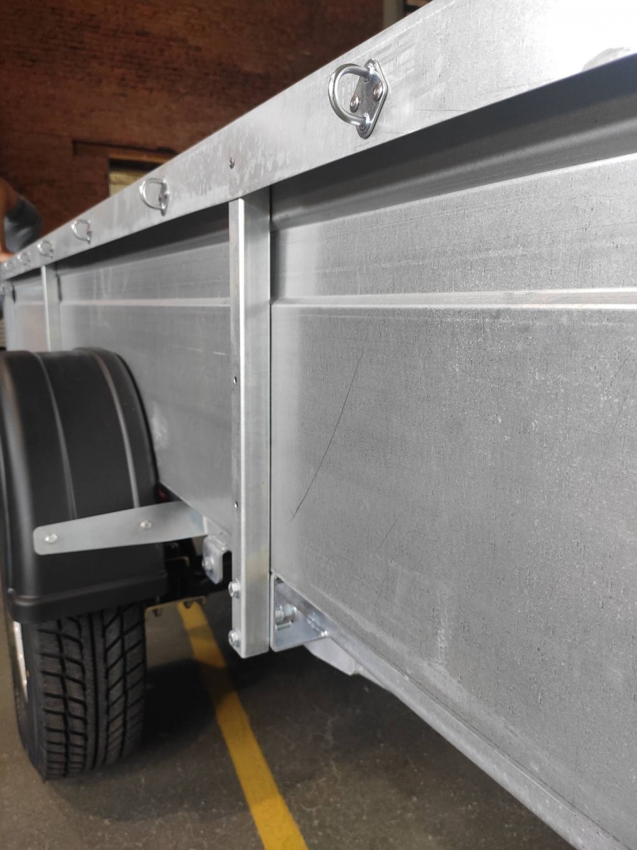 Цельные боковые борта крепятся 4 стойками (2 дополнительные центральные стойки), имеют дополнительные гибы для усиления, оборудованы скобами для крепления евро-тента. Имеют дополнительное жесткое крепление болтами к раме прицепа.