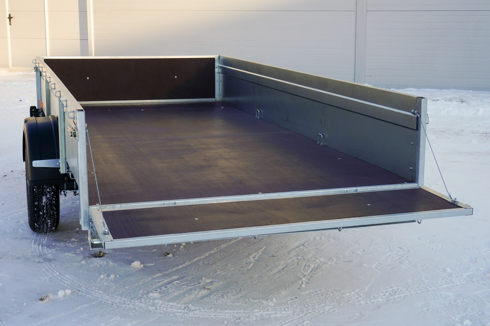 Прочный фанерный пол прицепа изготовлен из транспортной влагостойкой ламинированной фанеры 9 мм с сетчатым противоскользящим покрытием. Фанера утоплена в один уровень с передним и задним бампером. Прицеп оборудован механизмом наклона кузова, который фиксируется двумя усиленными замками-защелками.